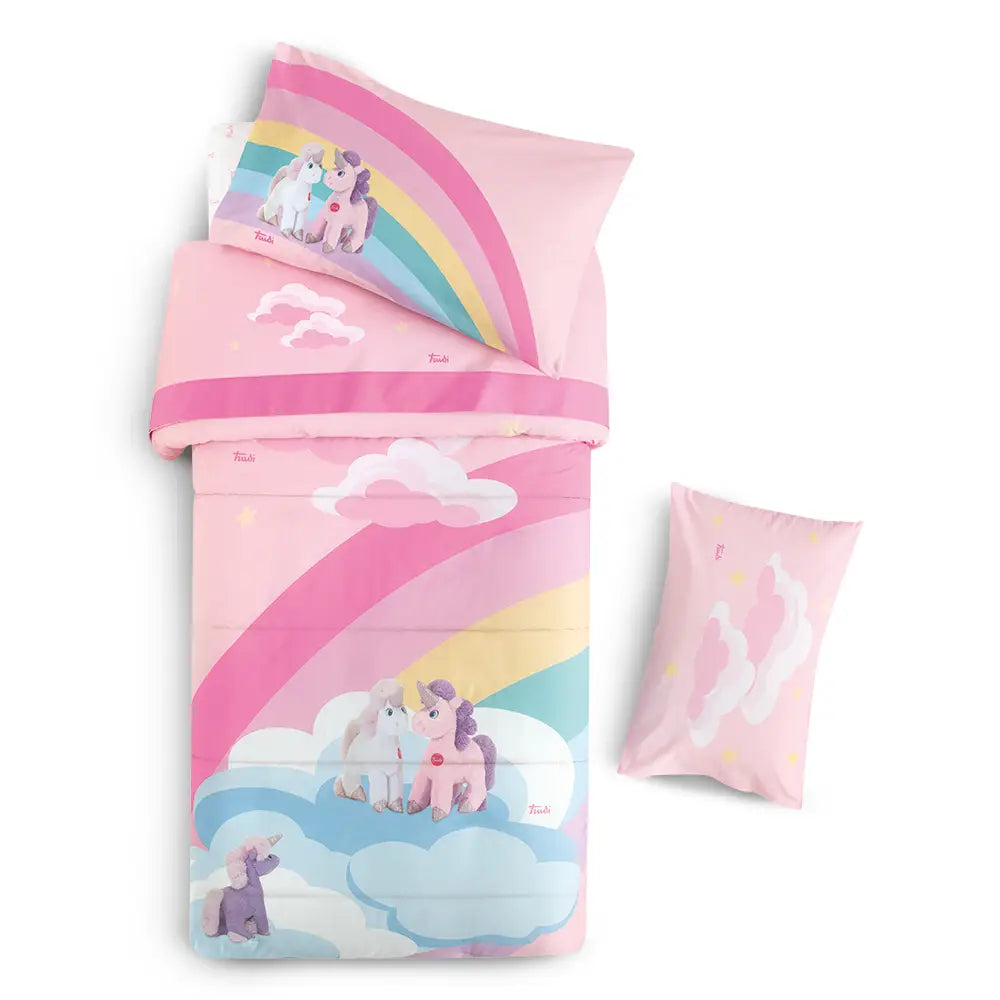Il Completo Copripiumino Lesly Singolo della Trudi Home è pensato per trasformare la cameretta in un ambiente dolce e accogliente. Il romantico design con unicorni e arcobaleni, in delicate tonalità rosa pastello, crea un’atmosfera fiabesca che accompagna i sogni dei più piccoli.