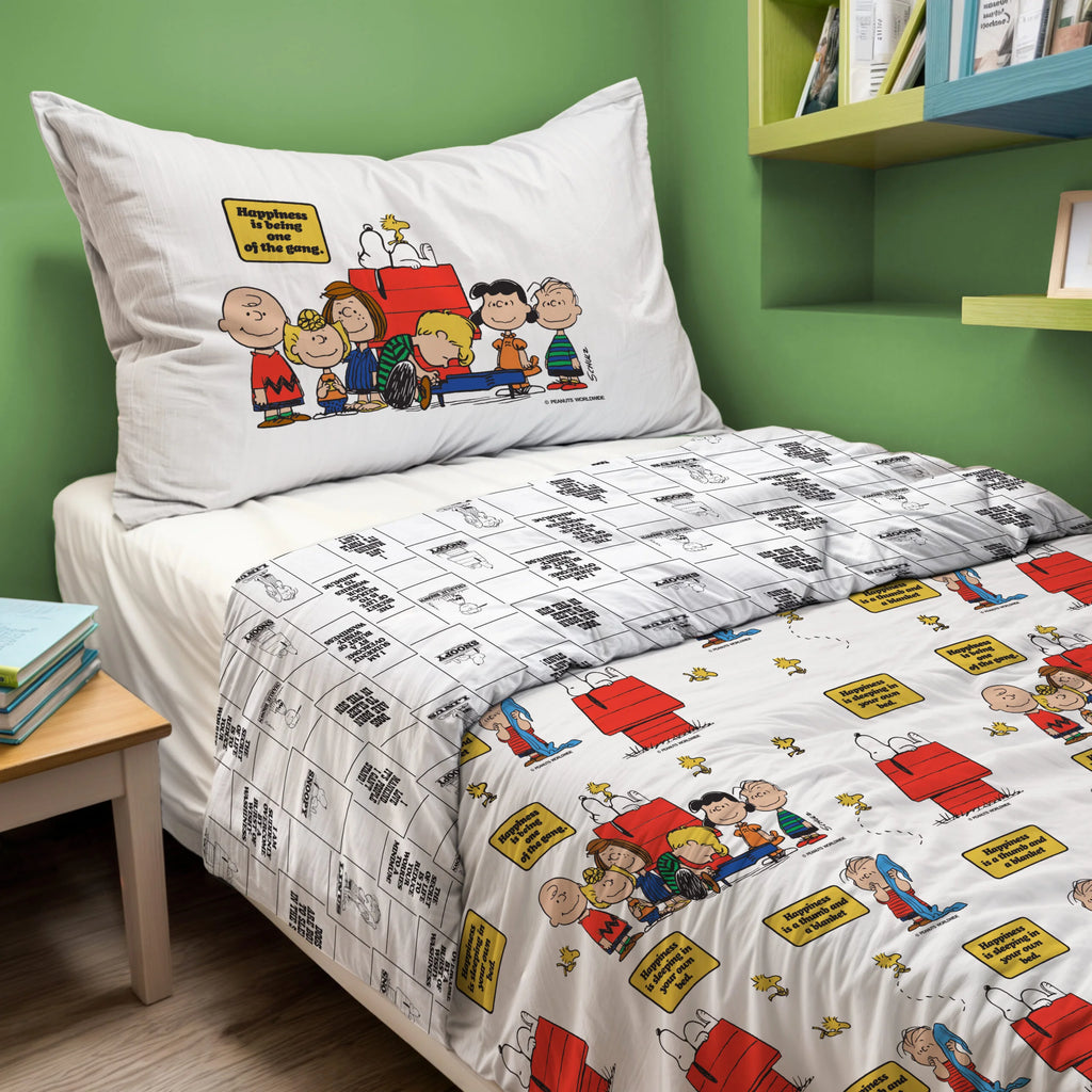 Realizzato in tela di cotone di alta qualità, il set garantisce freschezza, morbidezza e lunga durata. Il copripiumino presenta una stampa continua ricca di dettagli, mentre la federa piazzata raffigura i personaggi Peanuts in una scena iconica che celebra la loro inconfondibile simpatia.