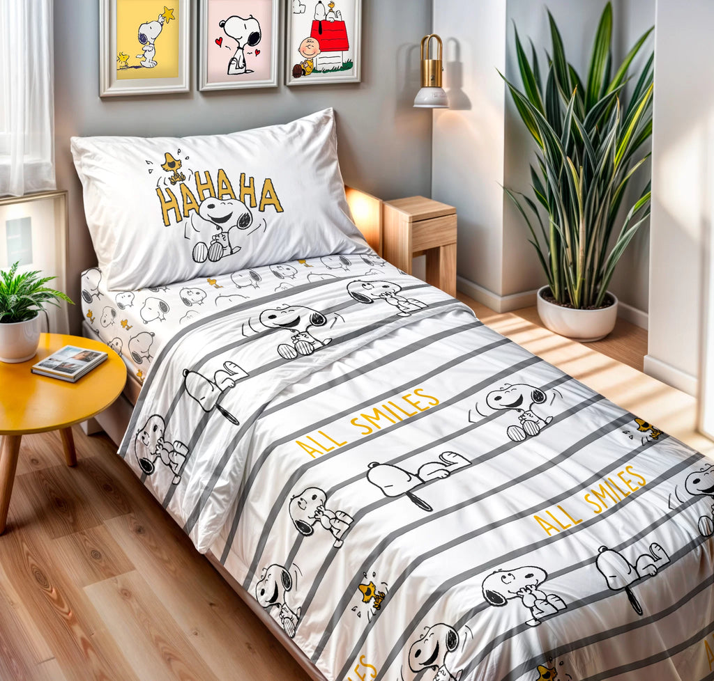 Rendi il letto un concentrato di allegria con il Completo Copripiumino Peanuts LOL, ispirato all’inconfondibile umorismo di Snoopy e Woodstock. Le stampe vivaci in stile fumetto, con la grafica “ALL SMILES” e l’iconica risata “HAHAHA”, trasformano la cameretta in uno spazio luminoso e pieno di buonumore.