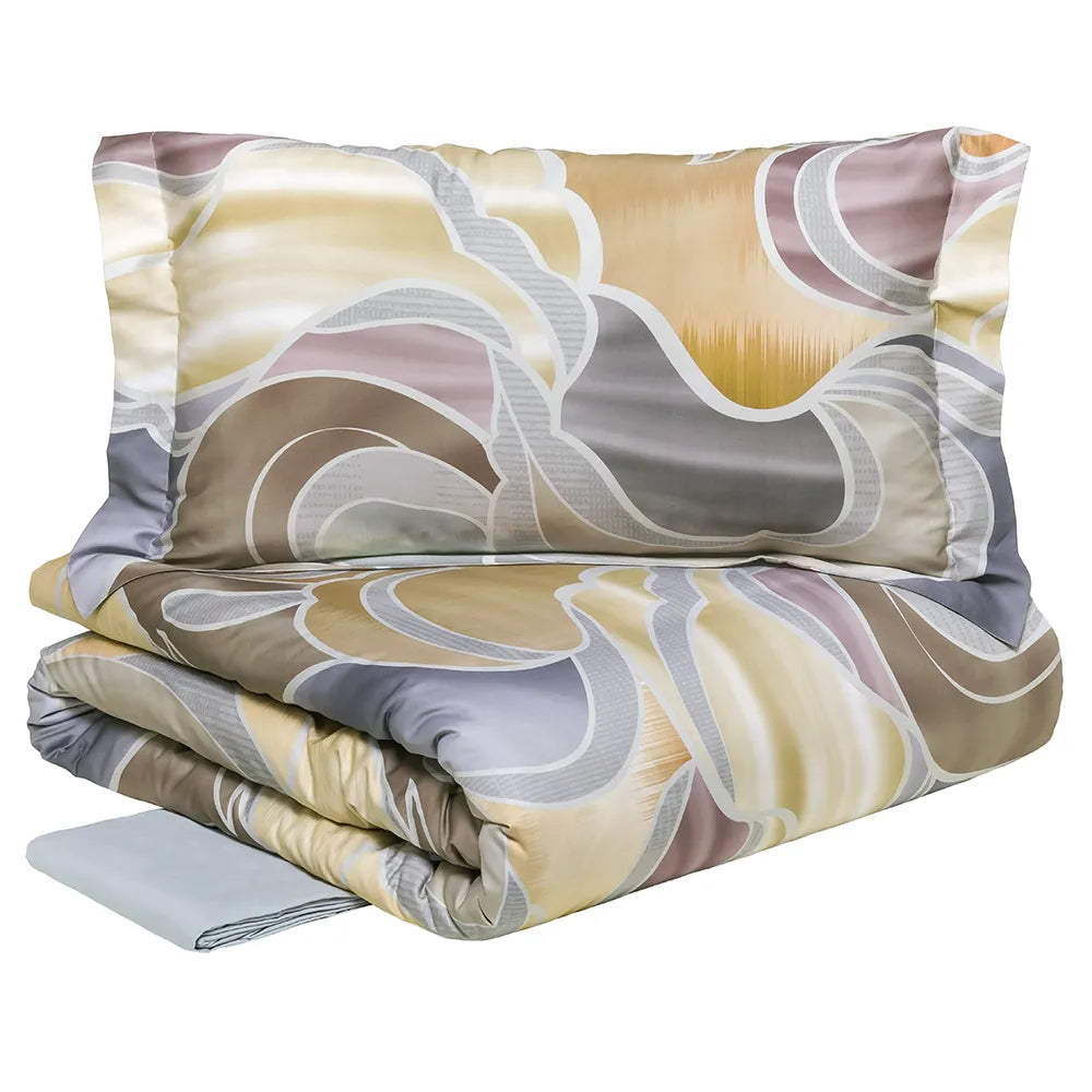 Completo copripiumino realizzato in percalle di cotone 200 T.C. La sacca e le federe a 3 volant sono stampati in digitale con motivi geometrici, il sotto con angoli è in tinta unita. Vesti la tua camera da letto con lo stile e la qualità inconfondibile di Tessitura Randi.