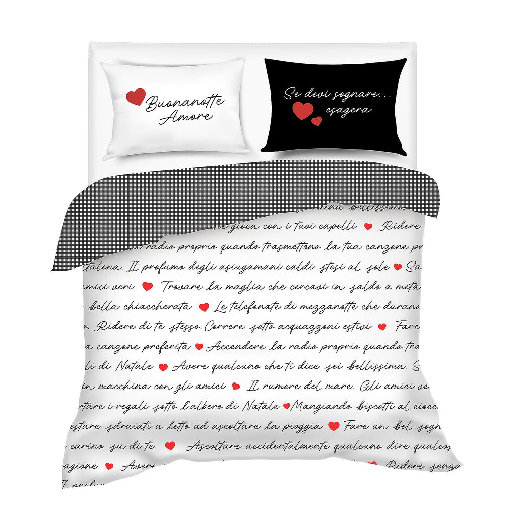 Le federe coordinate, con le scritte “Buonanotte Amore” e “Se devi sognare… esagera”, aggiungono un tocco unico e moderno.