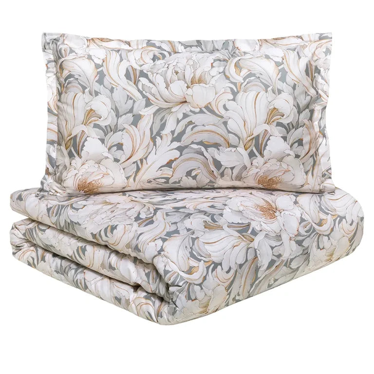 Completo copripiumino realizzato in raso di puro cotone 300 T.C. La sacca e le federe a 4 volant sono stampati in digitale con delicati motivi floreali; il sotto con angoli è in tinta unita. Vesti la tua camera da letto con le meravigliose fioriture dei giardini mediterranei e con la raffinatezza della collezione Bloom.