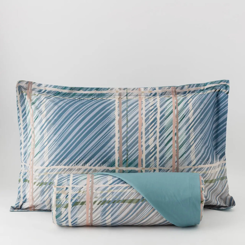La parure copripiumino Yuta, in puro percalle di cotone, è pensata per portare nella zona notte una ventata di eleganza grafica e comfort naturale. Il design si basa su una stampa digitale ad alta risoluzione ispirata al tartan, qui rivisitato in chiave leggera e contemporanea. Le linee sottili, che si intersecano con ritmo delicato, conferiscono movimento al tessuto, creando una superficie visivamente dinamica ma al tempo stesso equilibrata.