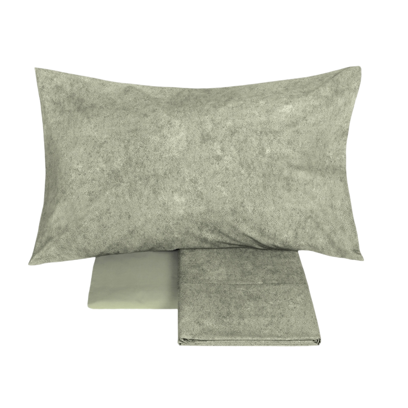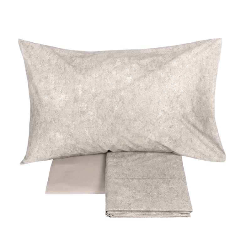Lenzuolo - copriletto in percalle stampato; federe a sacchetto in percalle stampato, con bordo tinta unita; lenzuolo con angoli in percalle tinta unita.