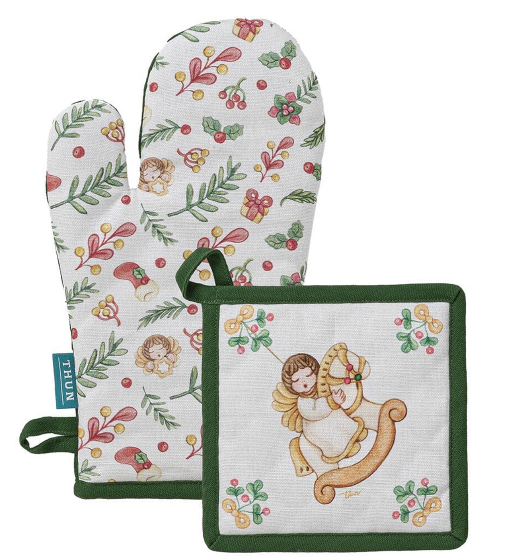 Porta l’atmosfera del Natale anche in cucina con il set presina e guanto della collezione “Sorprese di Natale” Thun. Realizzato in morbido tessuto di alta qualità, questo set è decorato con l’iconica stampa degli angeli Thun, simbolo di dolcezza e calore natalizio. Ideale per proteggerti durante la preparazione dei tuoi piatti delle feste, aggiunge un tocco di eleganza e magia anche nei momenti più semplici della giornata.