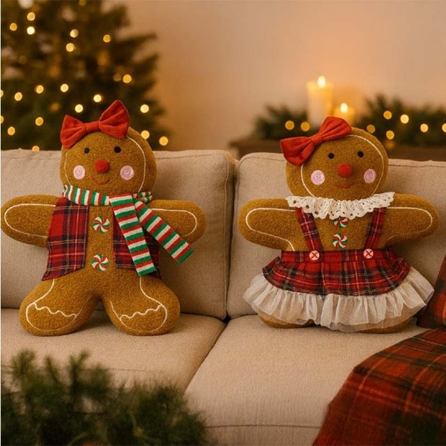 Il cuscino sagomato Zenzy di SG Home raffigura i simpatici omini di pan di zenzero, decorati con dettagli in tessuto scozzese e fiocchi colorati.