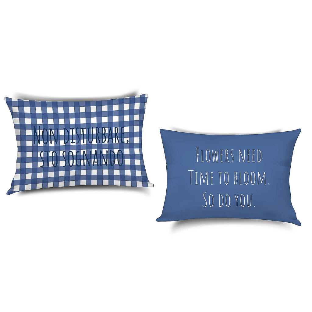 Realizzate in morbido raso di cotone, offrono un comfort avvolgente e uno stile moderno grazie alle stampe coordinate: una federa con fantasia a quadretti blu e la scritta “Non disturbare, sto sognando”, e l’altra con fondo blu pieno e la frase “Flowers need time to bloom. So do you.”