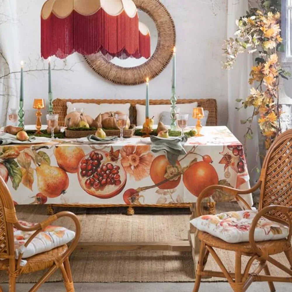 La tovaglia Blanc Mariclò della collezione Persimmon è realizzata in puro cotone e decorata con una vivace stampa autunnale che include cachi, pere, melograni, bacche e fiori dai toni caldi del rosso, arancio e ocra. Lo sfondo avorio valorizza il disegno botanico, rendendola perfetta per una mise en place stagionale, accogliente e raffinata. Ideale per arredare la sala da pranzo nei mesi autunnali, abbinata a candele, centrotavola in legno naturale o stoviglie rustiche.