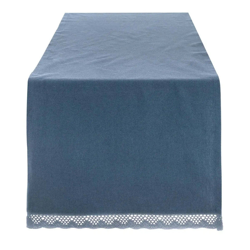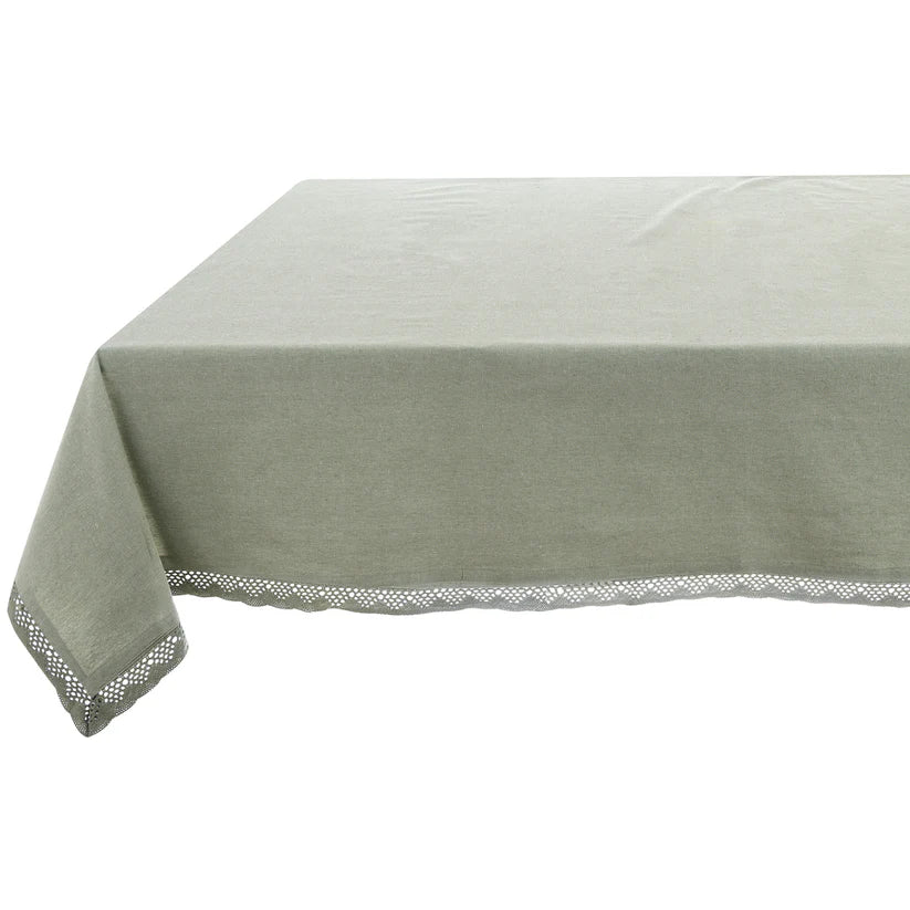 Tovaglia infinity della collezione di Blanc Mariclò, ispirata dalle campagne toscane, con un raffinato pizzo traforato.