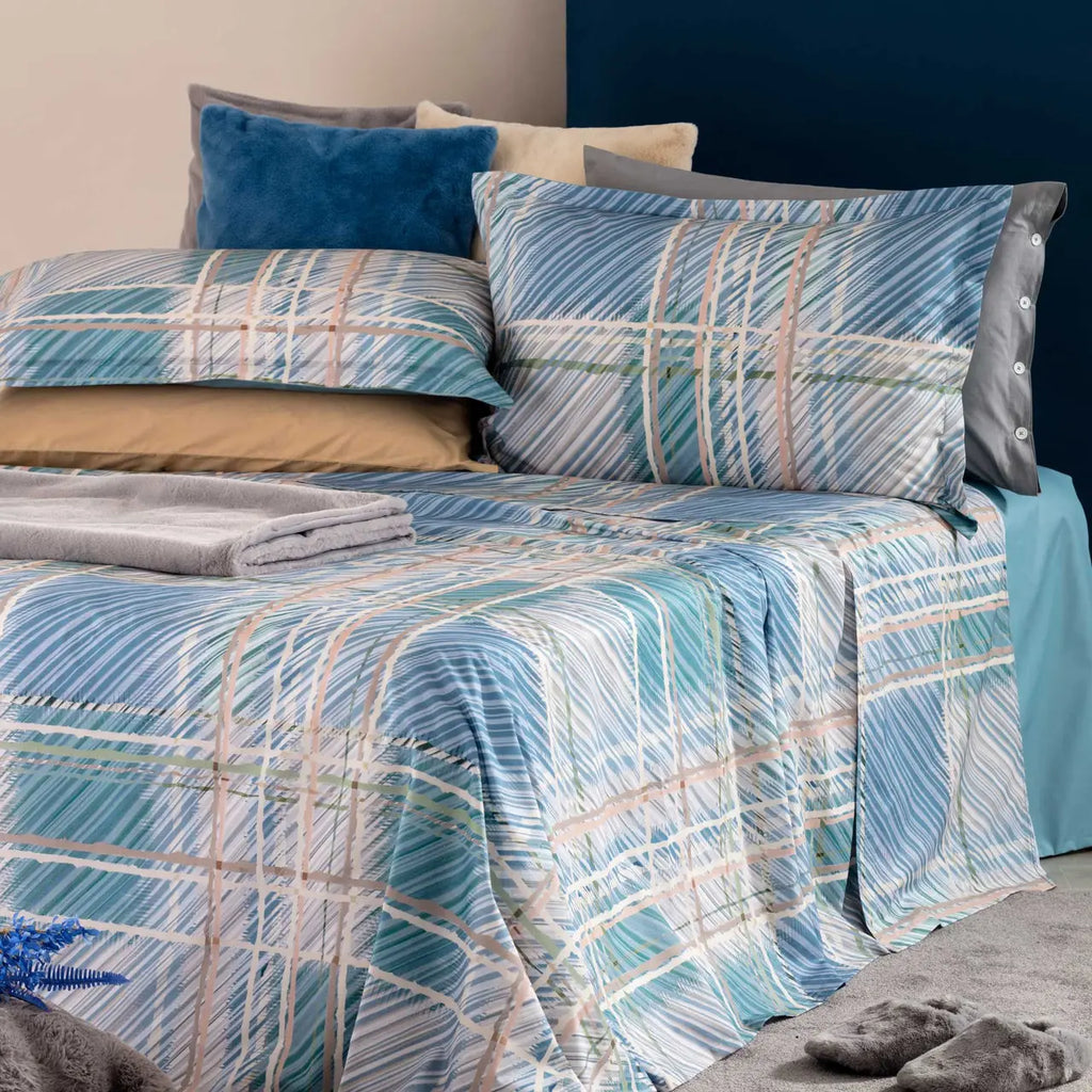 Il completo lenzuolo copriletto Yuta fonde estetica contemporanea e comfort naturale, grazie a una stampa digitale ad alta definizione su percalle 100% cotone. Il disegno tartan, composto da linee leggere e intrecci dinamici, si sviluppa sulla balza del lenzuolo e sul fronte delle federe con effetto copriletto, conferendo al letto un aspetto elegante e ordinato anche quando non è utilizzato.