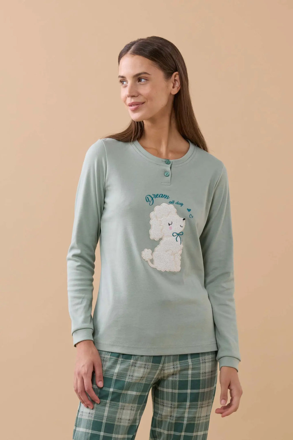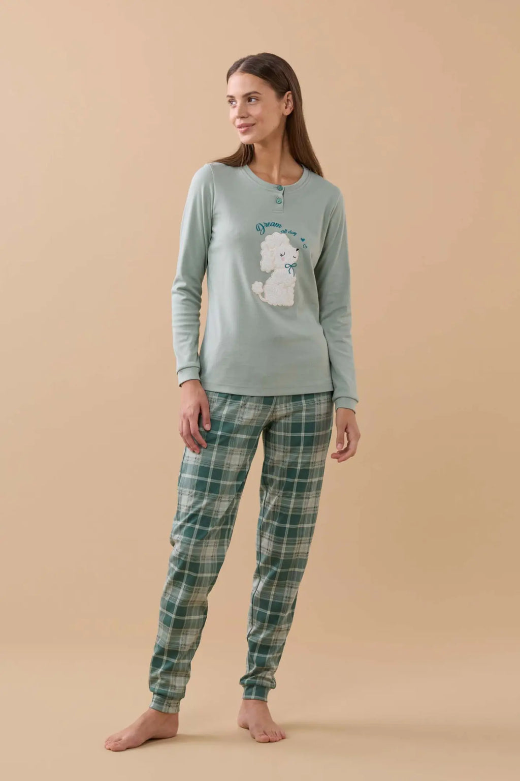 Pigiama donna in caldo cotone. Top unito a due bottoni con applicazione e ricamo al centro. Pantaloni con stampa scozzese e polsini.