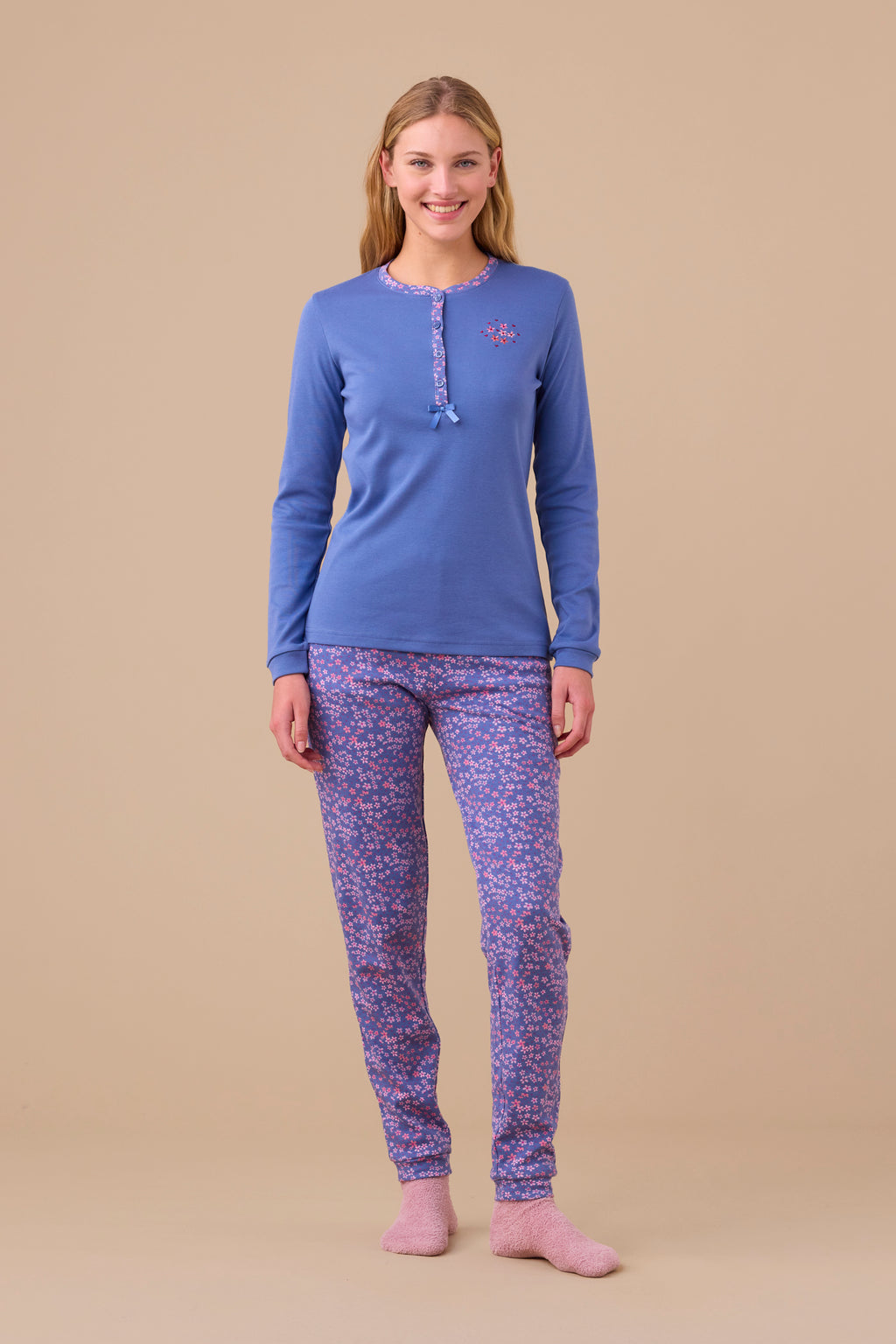 Pigiama donna in 100% cotone top manica lunga e collo a due bottoni, arricchito da un delicato cuore stampato e pantaloni lunghi abbinati, con stampa a micro-fiori e polsini sul fondo completano il look