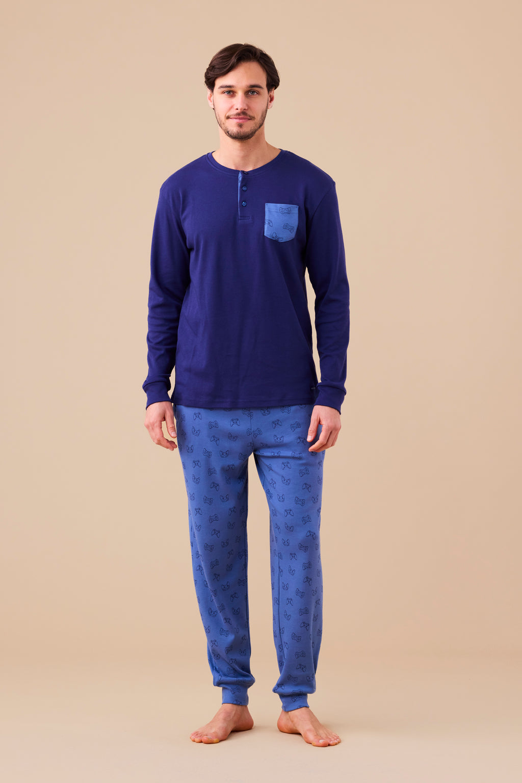 Pigiama uomo danny in morbido caldo cotone con collo tre bottoni e taschino a contrasto, pantalone tinta unita con comodi polsini