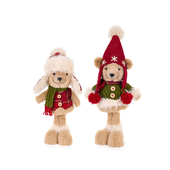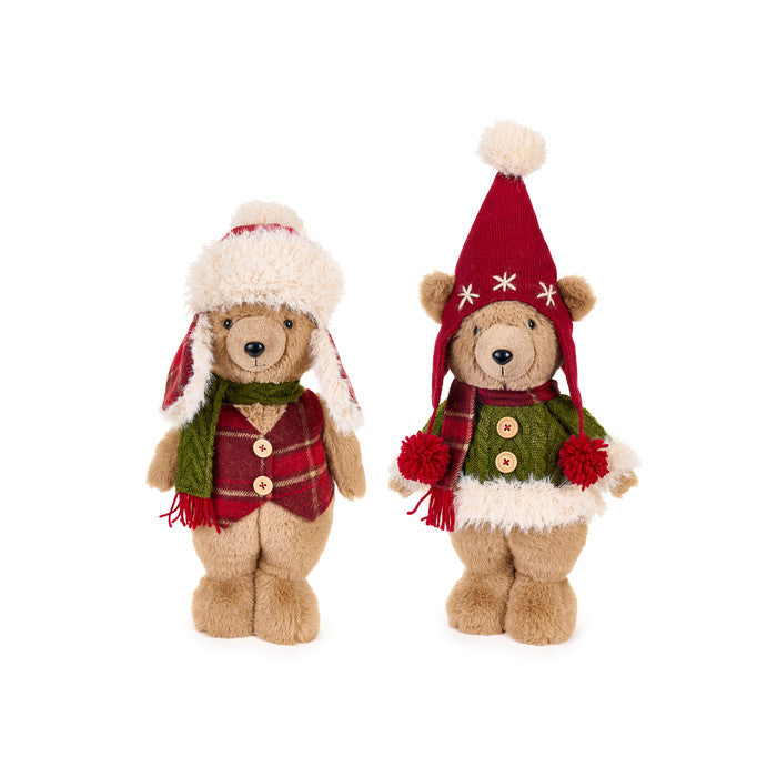 Realizzati con grande cura nei dettagli, questi teneri orsi in tessuto sono vestiti con abiti natalizi in tartan e maglia, arricchiti da pompon, bottoni e morbide finiture effetto pelliccia.