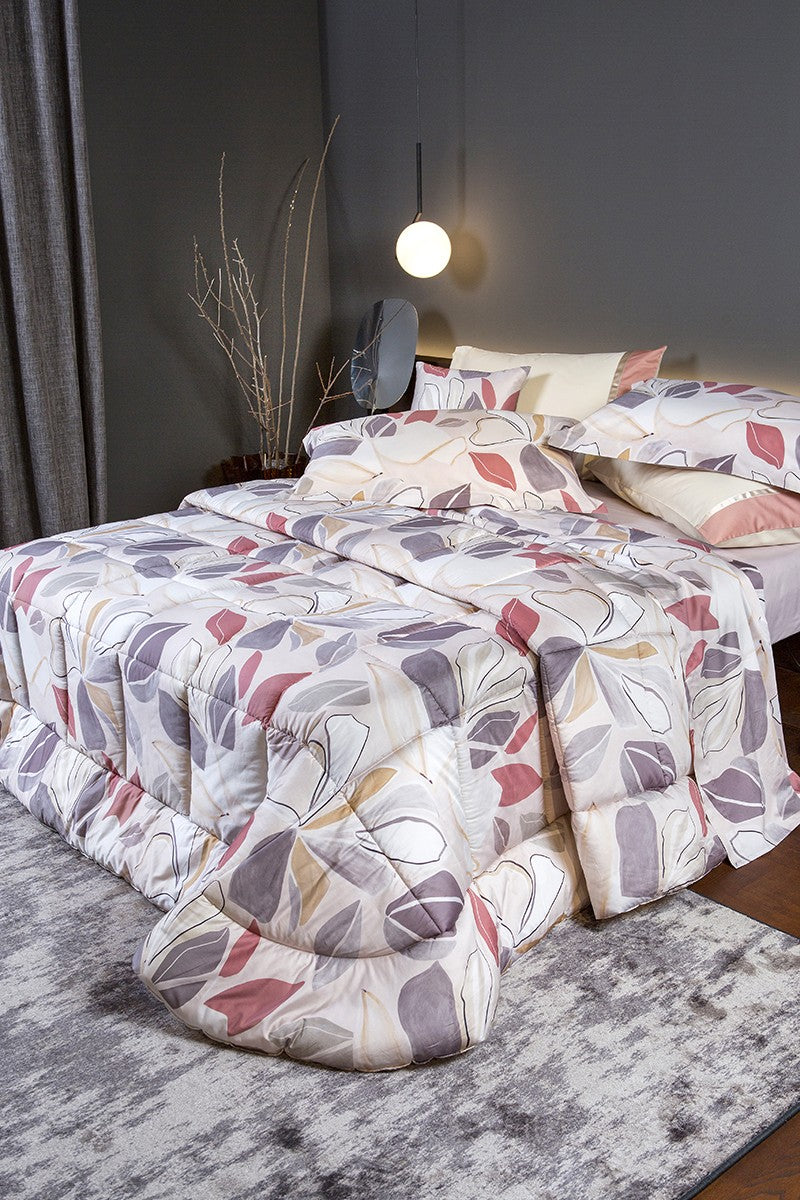 Trapunta in pregiato raso satin 100% cotone 300 TC stampa digitale con disegno floreale frutto di creatività e cura artigianale.