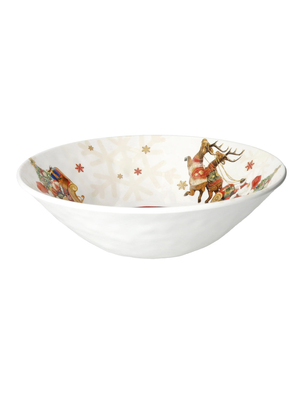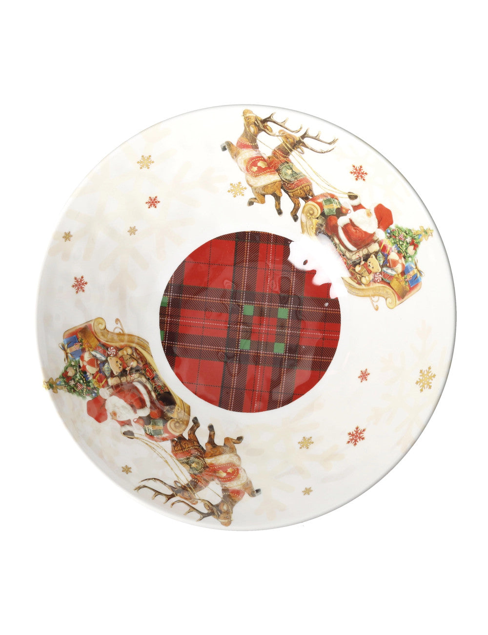 Realizzata in melamina leggera e resistente, presenta una splendida decorazione con Babbo Natale, renne e fiocchi di neve dorati, perfetta per servire frutta, dolci o snack durante le feste.