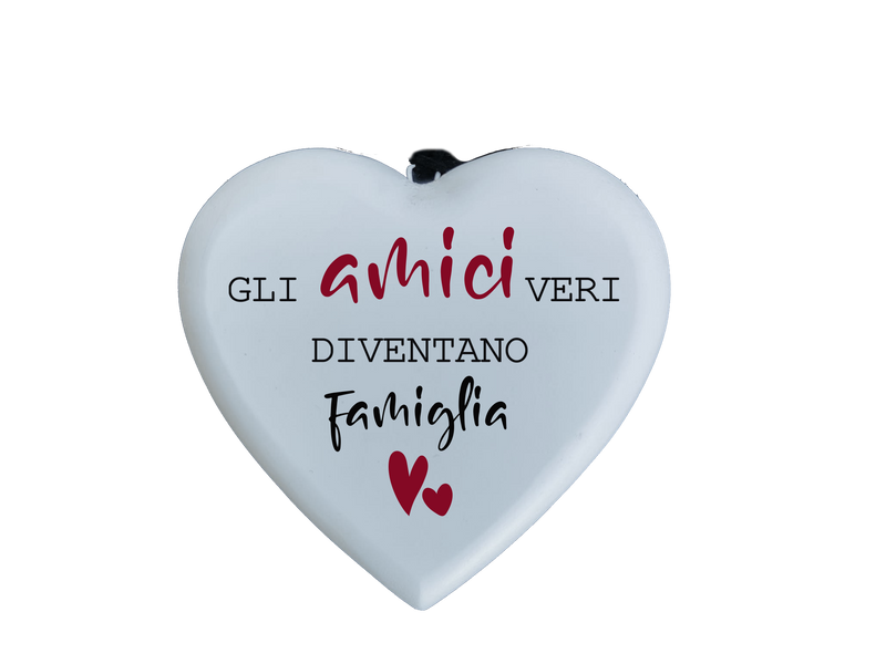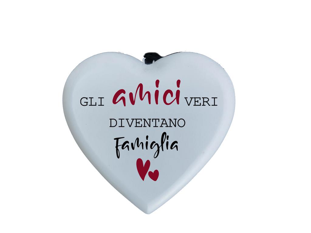 Per quegli amici che hanno saputo trasformare la complicità in un legame indissolubile. La dedica in legno verniciato "Gli amici veri diventano famiglia", a forma di cuore, è un omaggio autentico a chi è sempre rimasto accanto, scegliendoti ogni giorno. Realizzata artigianalmente, con materiali di qualità e un design raffinato, questa targa è un dono speciale, perfetto per ringraziare chi ha saputo diventare “casa”.