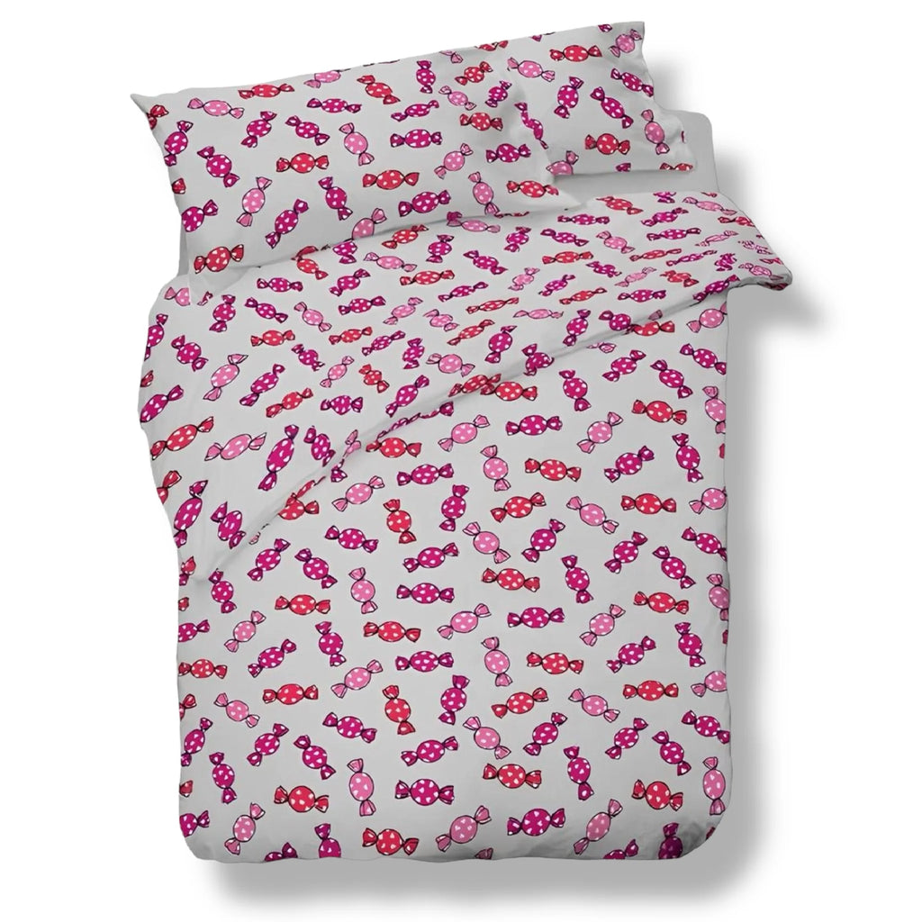Regala un tocco dolce e allegro alla cameretta con la parure copripiumino  Melle di Zambaiti. Realizzata in 100% puro cotone, garantisce morbidezza, freschezza e comfort durante il riposo. La fantasia con caramelle colorate su fondo grigio dona vivacità e rende unico l’ambiente. Un prodotto Made in Italy, sinonimo di qualità tessile e cura dei dettagli, pensato per durare nel tempo e accompagnare i sogni dei bambini.
