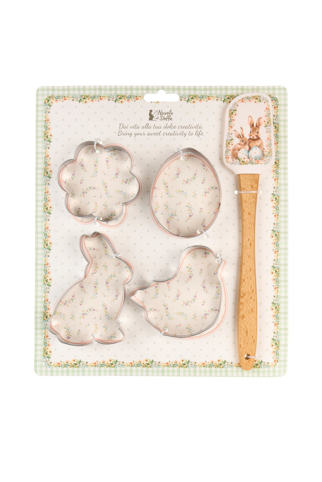 Il set comprende una spatola in silicone con manico in legno e quattro stampini in acciaio con simpatiche forme ispirate alla primavera e alla Pasqua, come coniglietto, uovo, pulcino e fiore. Ideale per lavorare impasti, decorare dolci e creare biscotti originali da condividere con famiglia e amici.
