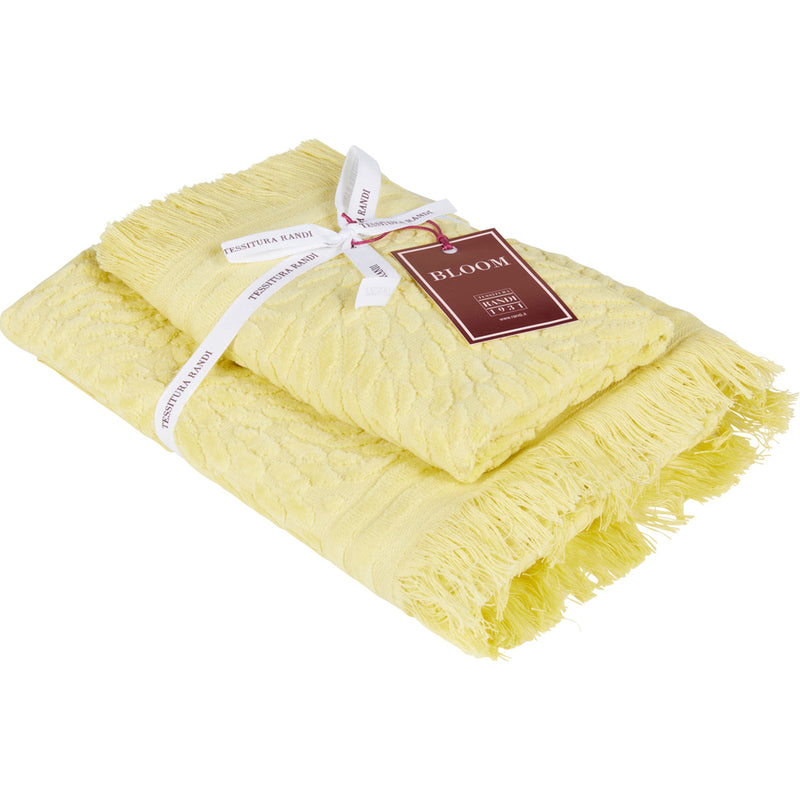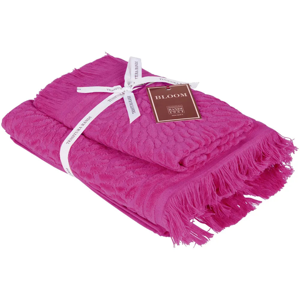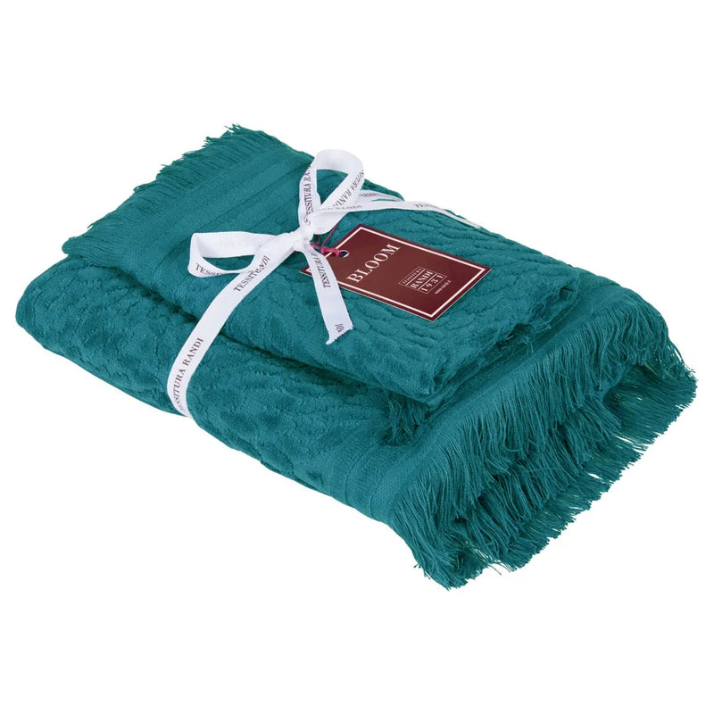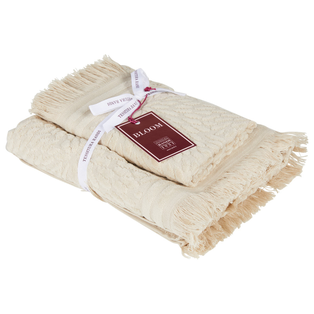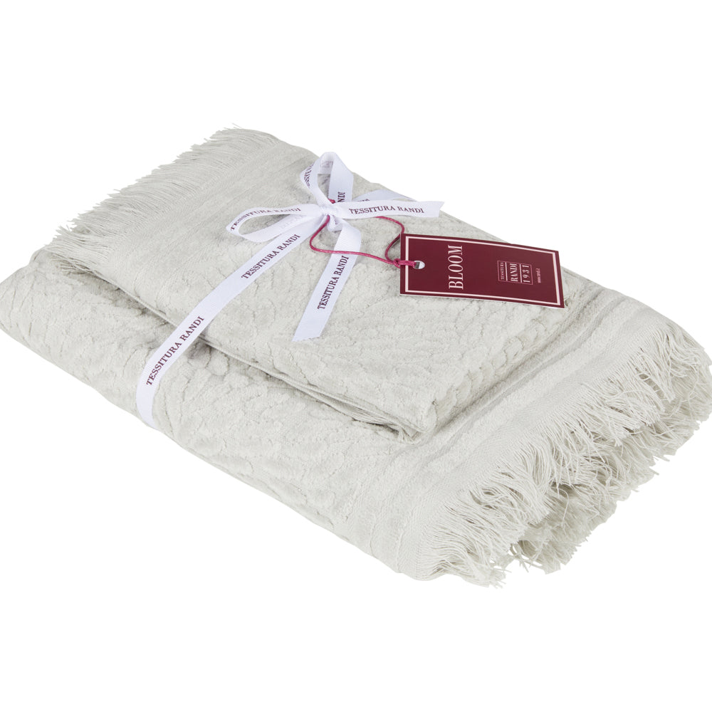 Set spugne 100% cotone velour con eleganti motivi jacquard e frange. Il trattamento del tessuto conferisce al capo un’assoluta morbidezza. Set composto da un asciugamano viso ed uno ospite. Vesti il tuo bagno con lo stile e la qualità di Tessitura Randi.