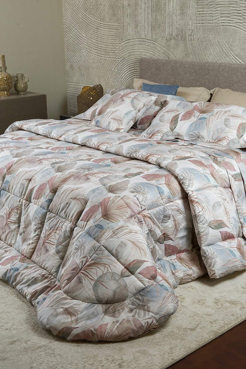 Trapunta in pregiato raso satin 100% cotone 300 TC stampa digitale con disegno esclusivo frutto di creatività e cura artigianale.